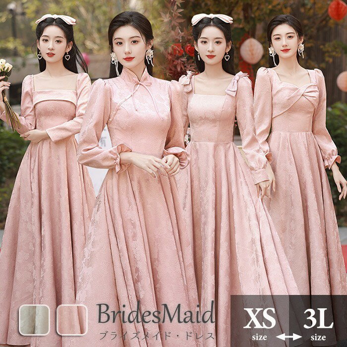 ブライズメイド ドレス ロングドレス 演奏会 ピアノ発表会 長袖 袖付き ピンク シャンパン色 編み上げ ショルダーネック つや有り 光沢感 サテン ワンピース レディース ..