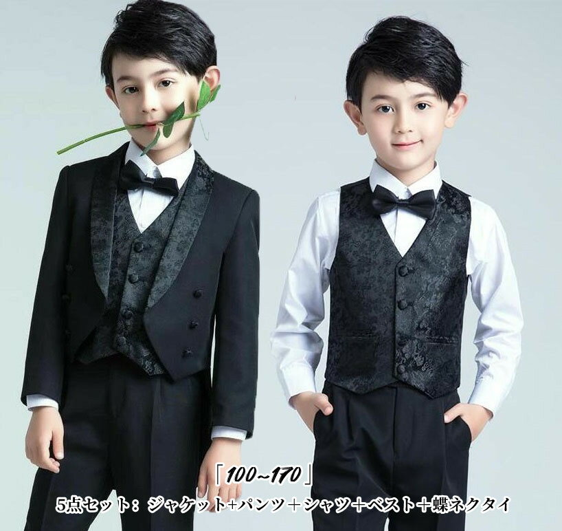男の子スーツ タキシードスーツ【品質良い】「100~170」演出服 演奏会 音楽会 演奏服 5点セットスーツ ジャケット パンツ シャツ ベスト 蝶ネクタイ 写真撮り 撮影服 高..