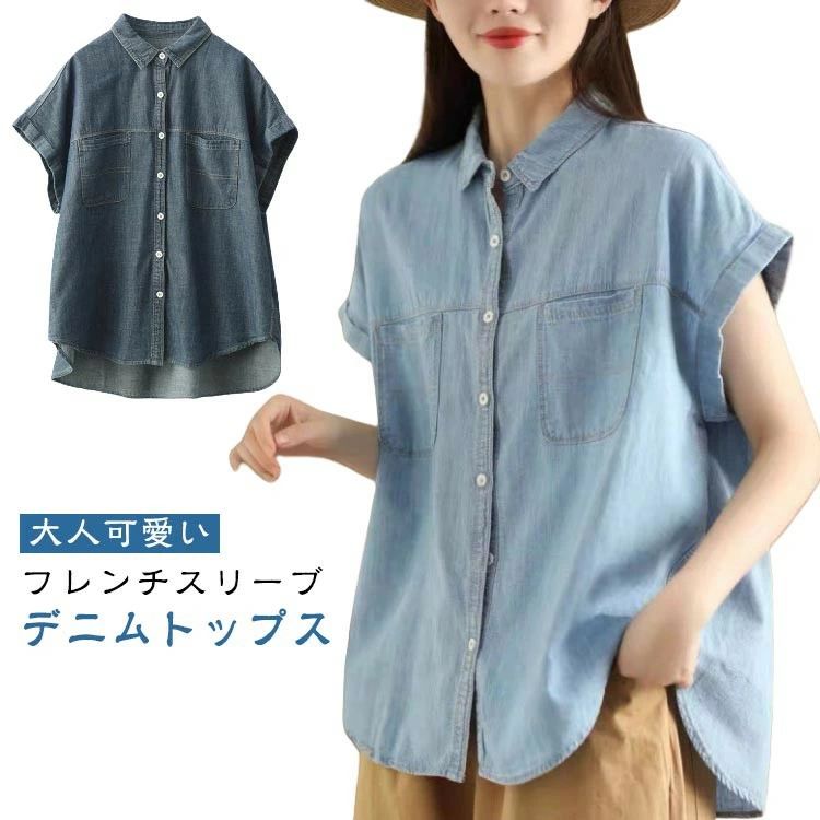 ブラウス きれいめ 通学 夏 シャツブラウス レディース デニム 半袖 トップス チュニック 半袖シャツ 体型カバー 無地 薄手 ボタン留め カジュアル 大人 通勤 フレンチス..