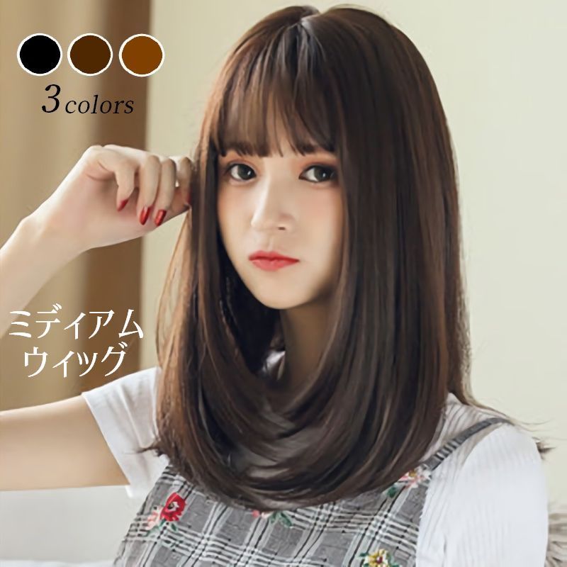 送料無料 フルウィッグ レディース ウィッグ ミディアム ロング 内巻き Cカール 前髪 ブラック ブラウン 黒髪 自然 ナチュラル かわいい