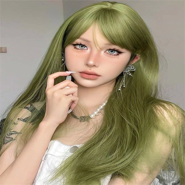 レディー レイヤー セミロング フルウィッグ ストレートカツラ 自然 ミディアム wig ロング 前髪 ウィッグ 通気 自然 グリーン系