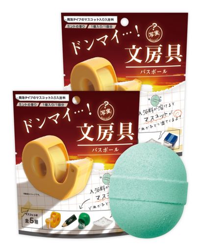 「まるで本物」と見間違えるほどの再現度が特長のマスコットが入った「写実」バスボールシリーズ 頑張りすぎちゃった、文房具のマスコットは全部で5種類(セロハンテープ、鉛筆、のり、三角定規、消しゴム) ミントの香り付き 内容量:50g(1回分) 注意事項:本品の外袋にはパッケージの膨張を防ぐために小さな穴を開けています。未開封の状態でも保存状態によって発砲が弱まる場合がありますが、仕様には問題ございません