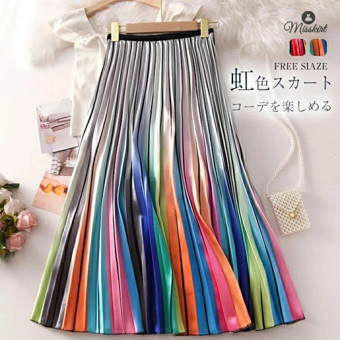 プリーツスカート ロング ロングスカート プリーツ フレアスカート ボトムス 虹色スカート スカート レディース フレア ロング丈 ミモレ丈 春夏 春 夏 ウエストゴム シン..