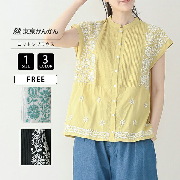 東京かんかん レディース トップス 春夏 ラクノウ 刺繍 コットンブラウス プリーツ 花 ボタニカル チカンカリ刺繡 インド綿 立体感 華やか ナチュラル カジュアル 25S063