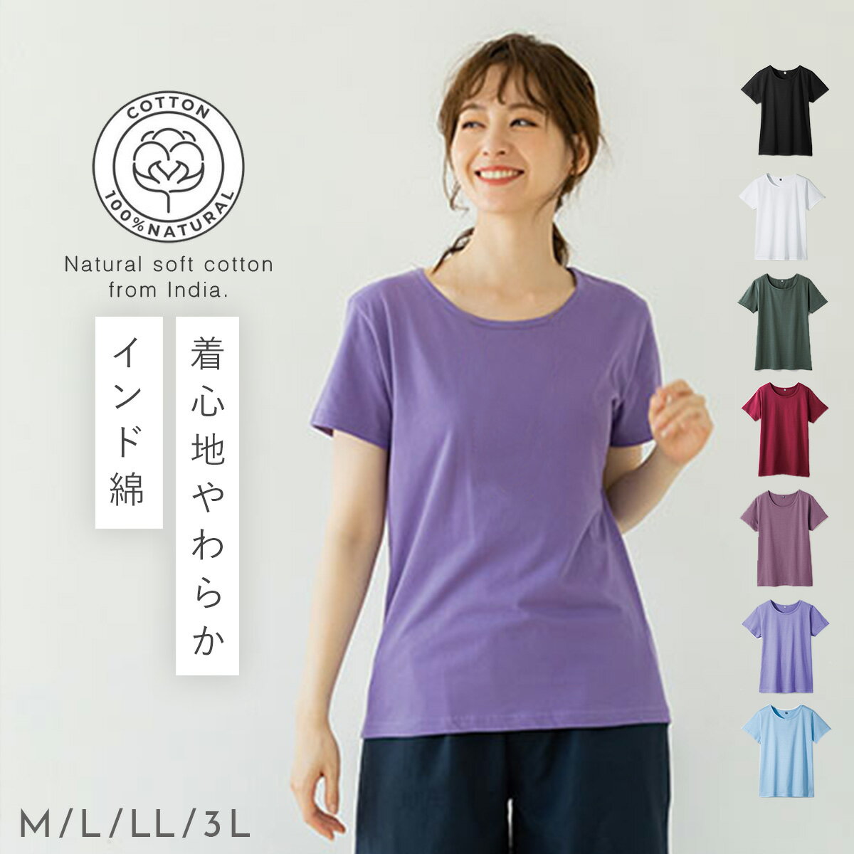 やわらかい 綿100%Tシャツ 半袖Tシャツ シンプル 丸首 クルーネック コットン インド綿 100% カットソー 定番 着回し サイズ展開 大きいサイズ レディース 男女兼用 LL 3..