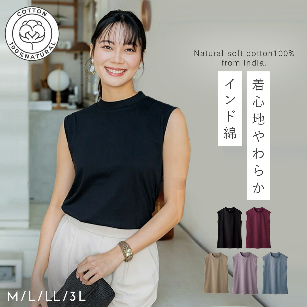 CODE 商品コード 141270260 ITEM 商品名 ノースリーブ インド綿 レディース モックネック 脇高 タンクトップ 綿100% 春 夏 きれいめ カジュアル インド綿モックネックノースリーブ エコテックス認証 敏感肌 乾燥肌 肌に優しい 説明文 トップス&インナーで使える、インド綿100%のノースリーブ。 インド綿(インドコットン)とは、インドで生産される綿花から作られた素材をさします。 アメリカや中国では、綿花は機械で収穫されることが多いですが、インドでは、昔ながらの「手摘み」採取がまだ残っています。 ひとつひとつ丁寧に手摘みされたインド綿は、綿花以外の不要な部分を摘み取らず、柔らかく、滑らかな肌ざわりな生地が特徴です。 当店で扱う『インド綿』のおすすめポイント 1.柔らかく、滑らかな肌ざわり インド綿は、洗濯によるごわつきがなく着心地が抜群。 2.お洗濯に強い 繊維が長く強度があるのもインド綿の特徴で、長く愛用できます。 3.通..