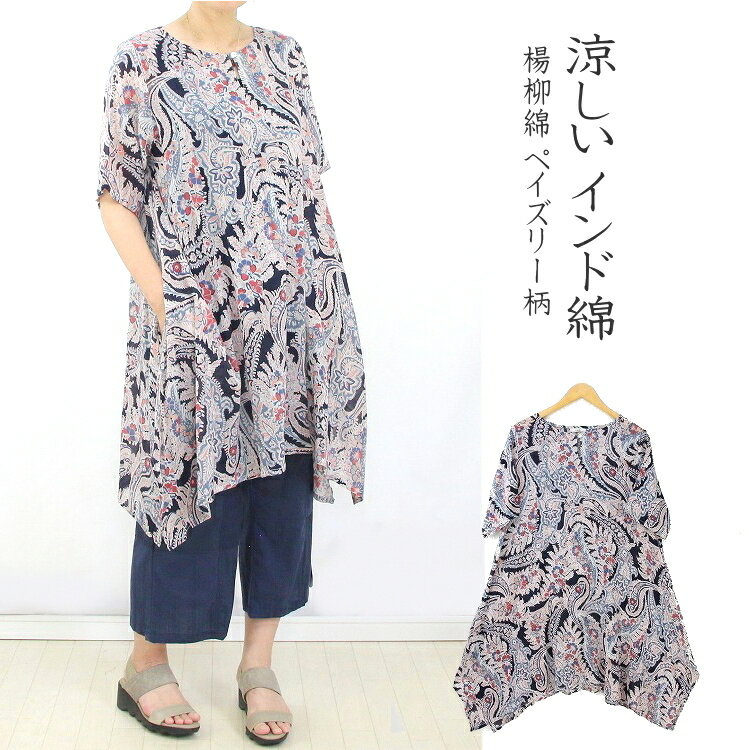 【メール便送料無料】インド綿 チュニック 楊柳綿 ペイズリー柄 軽い 涼しい ゆったり ヘムライン