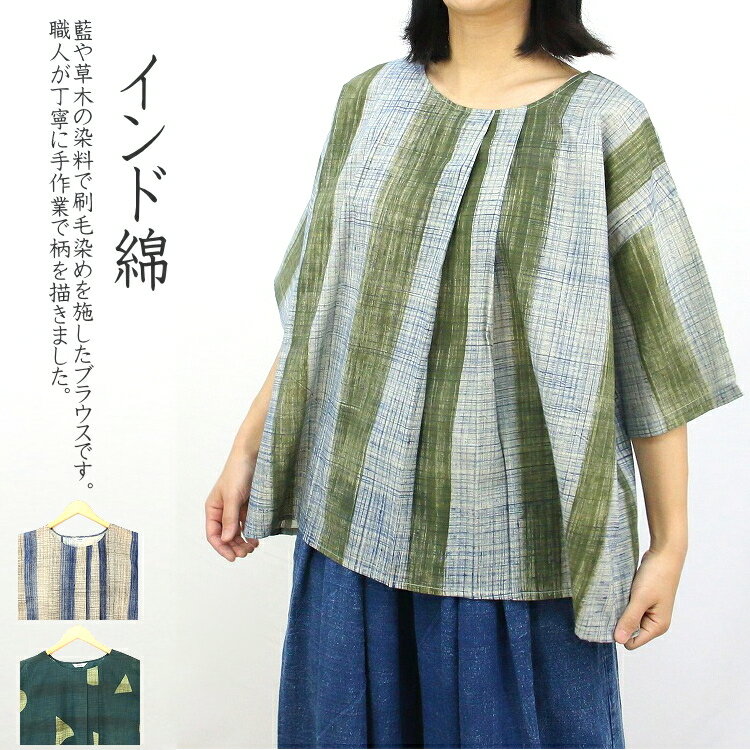 【メール便送料無料】インド綿 ブラウス 藍染 草木染 オーバーサイズ ドロップショルダー ゆったり 涼しい 軽い ショート丈