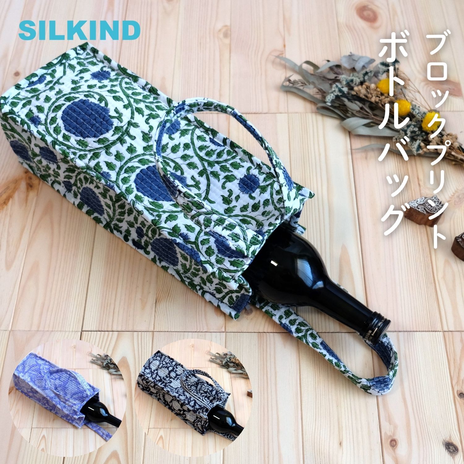 ボトルバッグ インド綿 ブロックプリント グリーンプラント/パープル/ブラックおしゃれ かわいい 花柄 ボトルバッグ 布製バッグ キルティングバッグ エシカル ハンドメイ..