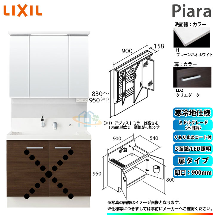 ★[AR3N-905SYN_LD2H+MAJX2-903TZJU] リクシル LIXIL INAX Piara ピアラ 洗面台 900mm 扉タイプ 3面鏡 ミドルグレード木目LD2クリエダーク 寒冷地 ◇