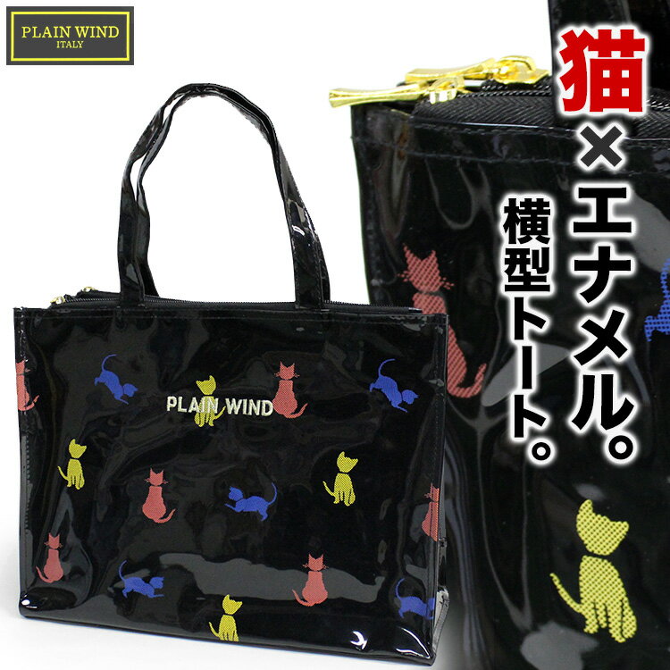 ネコ柄エナメルバッグ PLAIN WIND #4710 横型トートバッグ レディース 猫柄 ブラック A4書類収納可 エナメル つやつや 光沢 プリントバッグ 動物 アニマル