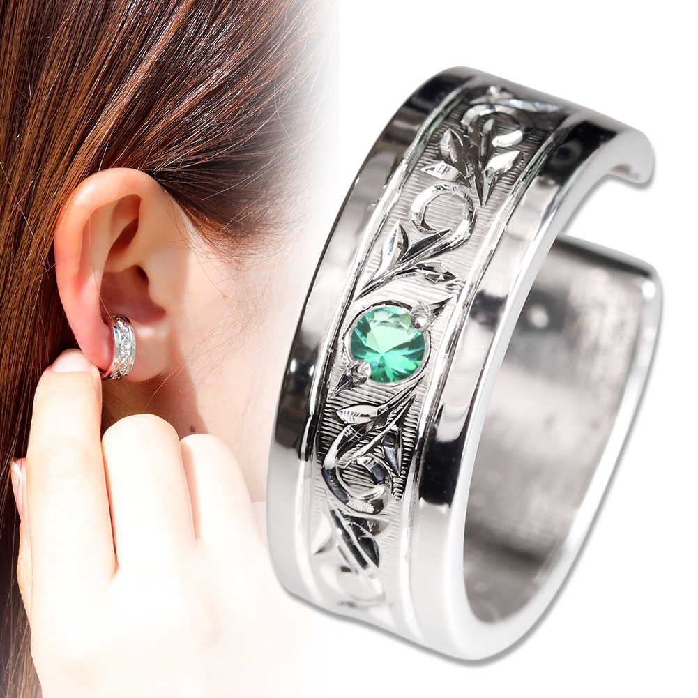 イヤーカフ プラチナ レディース かっこいい 太め 彫り 彫金 イヤカフ 片耳用 エメラルド ノンホールピアス 重ねづけ 大人 おしゃれ 女性用