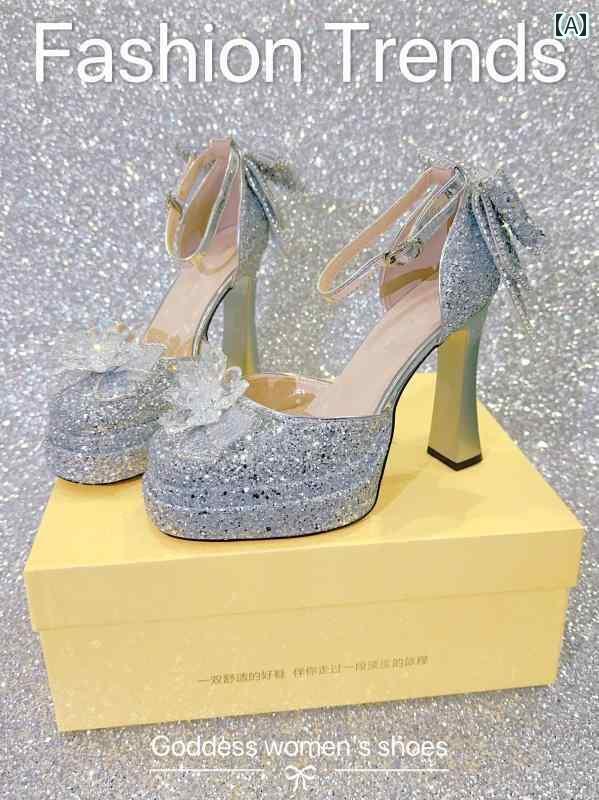レディース ヒール おしゃれ 疲れにくい メリージェーン ハイヒール シルバーの 厚底 ヒール 防水の ある 靴 底 つま先が 閉じた サンダル クリスタル ガラスの 花の ウェディングシューズ