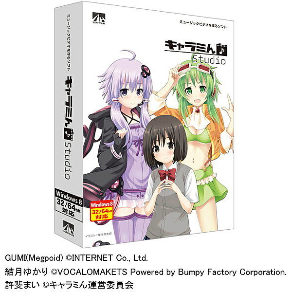 「キャラミん Studio」は3Dキャラクターと音楽ファイルを選択するだけで簡単に踊らせることができるミュージックビデオ作成ソフトです。※こちらは【取り寄せ商品】です。必ず商品名等に「取り寄せ商品」と表記の商品についてをご確認ください。「キャラミん Studio」は、3Dキャラクターと音楽ファイルを選択するだけで、簡単に3Dキャラクターを曲に合わせて踊らせることができるミュージックビデオ作成ソフトです。予め3Dキャラクターが収録されていますので、このソフトだけですぐにキャラクターを音楽に合わせて踊らせることができます。踊りやカメラワーク、ビートは自動でも、自分で設定してもOK。さらに歌詞に合わせてリップシンクさせることも可能です。モデルやステージなどは追加可能!これでどんどんPVを作りましょう!(Core 2 Duo 2.0GHz以上。Windows XP(SP3以降、32bitのみ)/Vista/7/8)