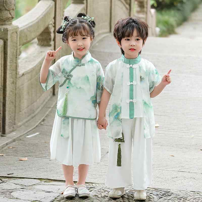 キッズ 子供 ファッション おしゃれ 衣装 韓服 夏 チャイナ風 セット 幼稚園 パフォーマンス 中国風 レトロ グリーン ボーイズ 女の子 半袖