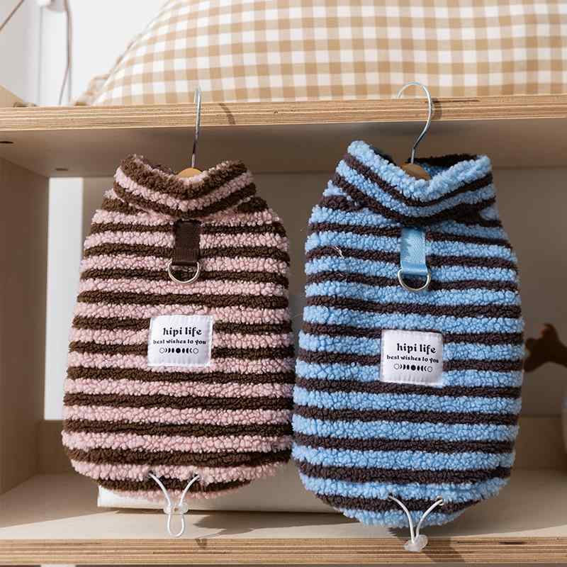 ペット服 小型犬 子犬 子猫用 秋冬 保温 あったか ストライプ もこもこ フリース ルームウェア お散歩着 ブルー ピンク XS S M L XL XXL