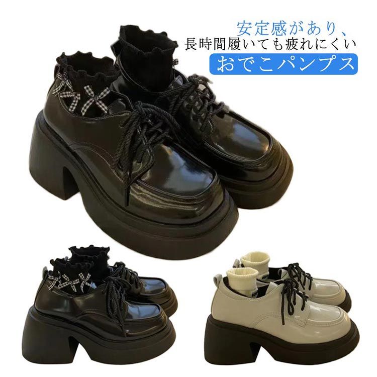 パンプス レディース 靴 厚底 ジュース おでこパンプス ヒールスニーカー 厚底ブーツ 美脚 コスプレ ロリータ 太ヒール レースアップ 歩きやすい 黒 ブラック量産型 地雷..