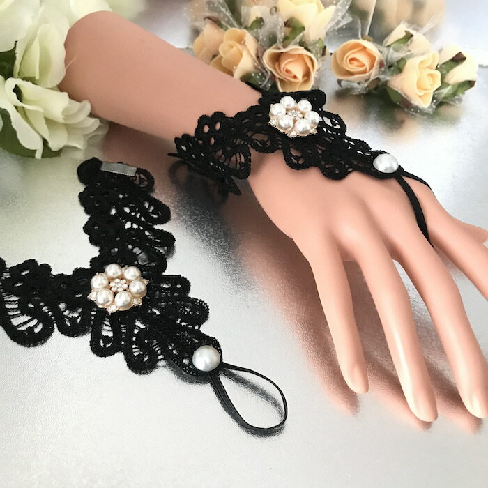 パールビーズ付きお花模様のレースカフスです。 社交ダンス等のダンス衣装に、 イベント、コスプレ、カラオケ、ドレスアップ、 ダンスコスチュームや舞台衣装などに合わせると綺麗です。 サイズ:H18cm W12cm カラー:ブラック 手首の周りは金具で調整が出来ます。 ※当店オリジナルデザインのハンドメイドです。
