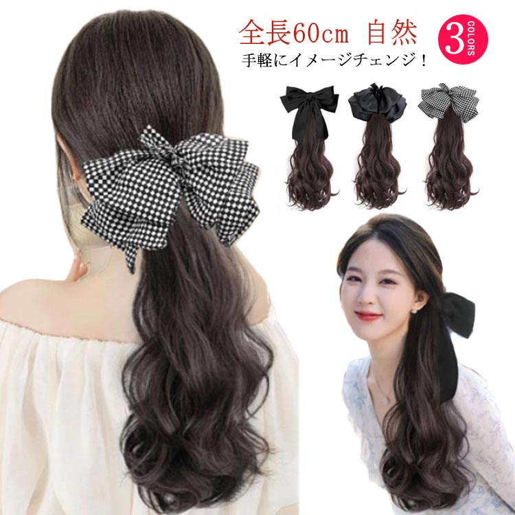 リボン付き ポイントウィッグ ウェーブ ワンタッチ 自然 ロング カール ウイッグ つけ毛 クリップ エクステ ウィッグ 結婚式 ハロウィン コスプレ ブラック ブラウン ポ..