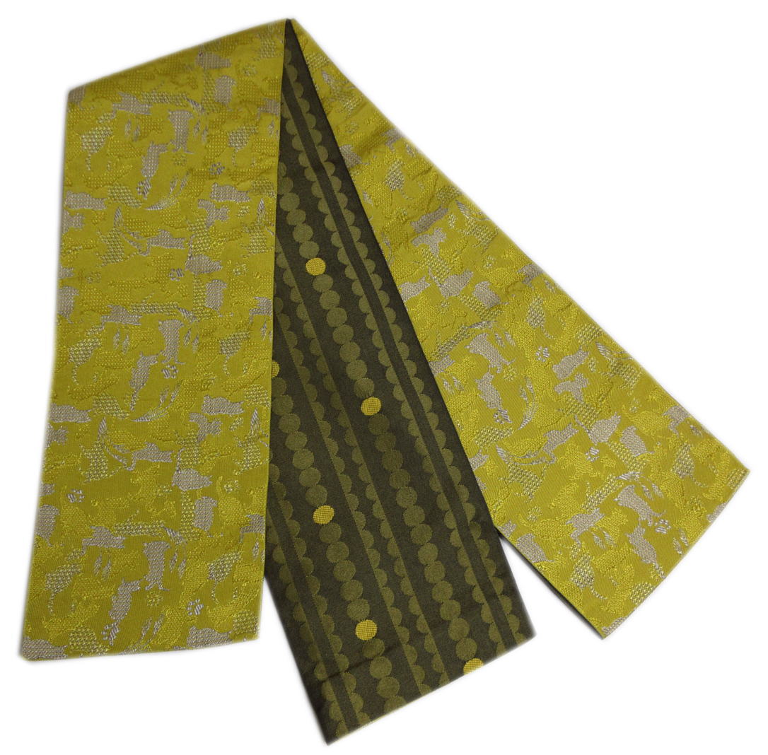 洗えるきもの&小紋・紬等のカジュアル着物に。 オシャレな色柄で艶やかコーデ出来上がり。 着物姿がより上品&オシャレに。 普通より40cm程長い長尺ですので、変わり結びも し易く、ふくよかさんにもGOOD。 リバーシブルなので、一本で2柄楽しめます。 お持ちのお着物に合わせて更にワンランクUP。 猫足跡柄&ドット柄が可愛くオシャレ。 雰囲気の違った柄ですので、使い分け出来便利。 どんなお着物にも合わせ易く、年代幅も広くお使い頂ける色柄です。 浴衣の時の帯結びでOK。 やわらかく結び易いので着物初心者&お稽古にも最適。 ポリエステル素材でお手入れも簡単。 画像6の帯地コースター付。 (サイズ):長さ約4.4m・巾約16.5cm (素材):ポリエステル100%・日本製 ※写真の柄と同じ生地で作ったものをお送りしております。裁断により多少柄の出方がひとつずつ違いますが、風合いは変わりませんのでご了承お願いします。