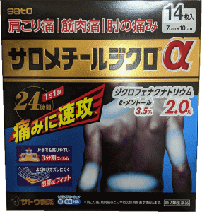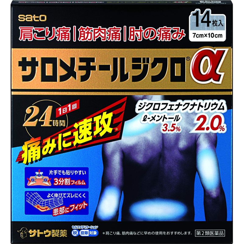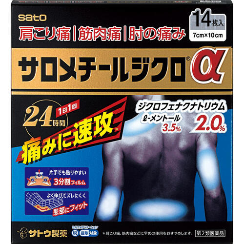 ■サロメチールジクロα【佐藤製薬】 ジクロフェナクナトリウムを配合した鎮痛消炎テープ剤です。1日1回で効きます。貼った部分から心地よい清涼感が広がります。貼りやすい,たて・よこ伸縮自在のテープ剤です。 内容量 14枚 効能・効果 関節痛,肩こりに伴う肩の痛み,腱鞘炎(手・手首の痛み),肘の痛み(テニス肘など),筋肉痛,腰痛,打撲,捻挫 用法・用量 プラスチックフィルムをはがし,1日1回1〜2枚を患部に貼ってください。ただし,1回あたり2枚を超えて使用しないでください。なお,本成分を含む他の外用剤を併用しないでください。★15歳未満の小児は使用しないでください。 ●用法関連注意 (1)定められた用法・用量を厳守してください。 (2)1回あたり24時間を超えて貼り続けないでください。さらに,同じ患部に貼りかえる場合は,その貼付部に発疹・発赤,かゆみ,かぶれなどの症状が起きていないことを確かめてから使用してください。 (3)..