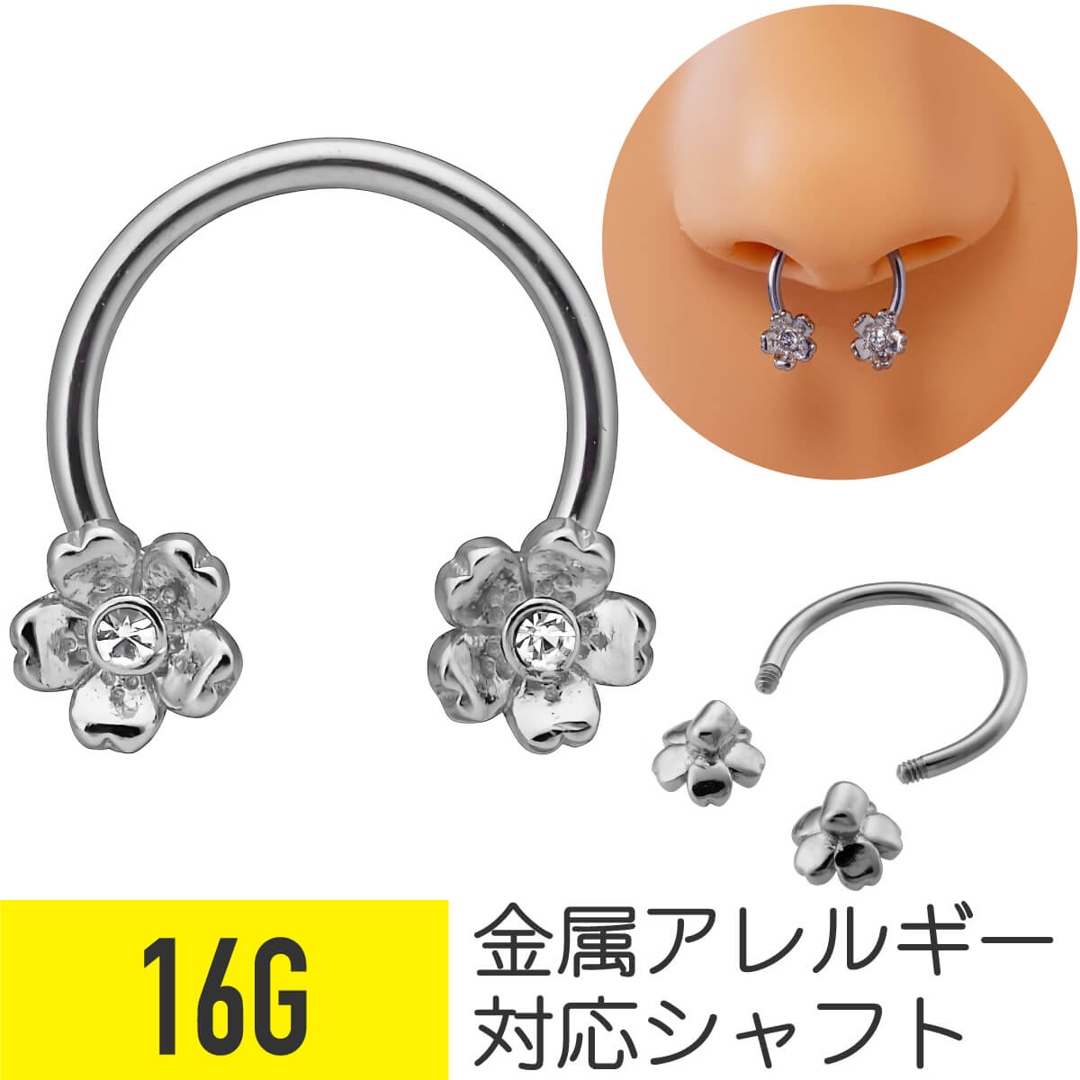 フラワー サーキュラーバーベル 16G サージカルステンレス シルバー イヤーロブ セプタム 鼻ピアス 軟骨ピアス ボディピアス 花 桜 金属アレルギー対応
