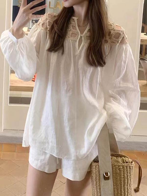 セットアップ レディース 苎麻 かぎ針編み 長袖ブラウス ショートパンツ 上下セット 通勤 カジュアルスタイル 白 麻 綿 春秋