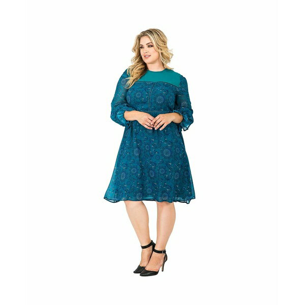 スタンダーズアンドプラクティス レディース ワンピース トップス Plus Size Women's Knee-Length Puff Sleeve Chiffon Dress Turq paisley