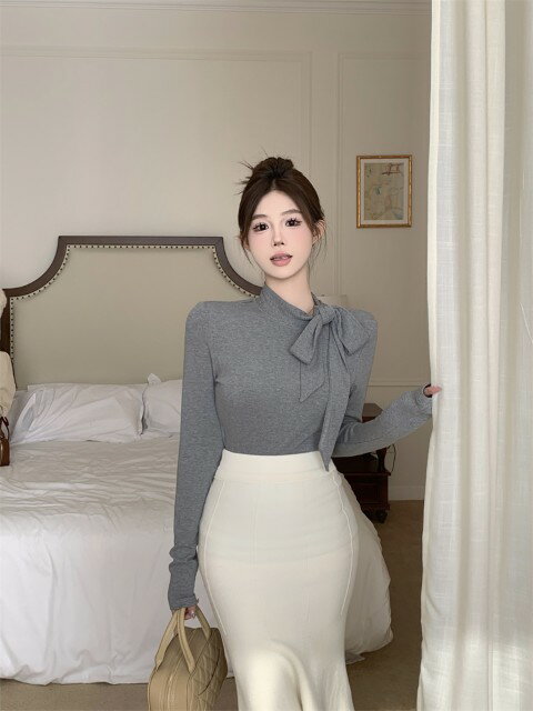 長袖 Tシャツ 裏起毛 ストラップ スリム【大きいサイズ レディース 秋冬 チュニック フォーマル オフィス ボウタイ シフォン シャツ インナー blouse】