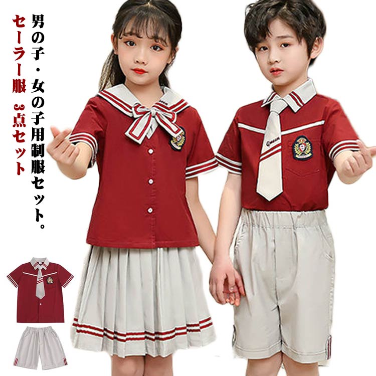 キッズ スーツ セーラー服 3点セット 女の子 男の子 制服 スーツ 子供服 卒業式 半袖 プリーツスカート ハーフパンツ セットアップ フォーマル ジュニア 入学式 夏 小学..