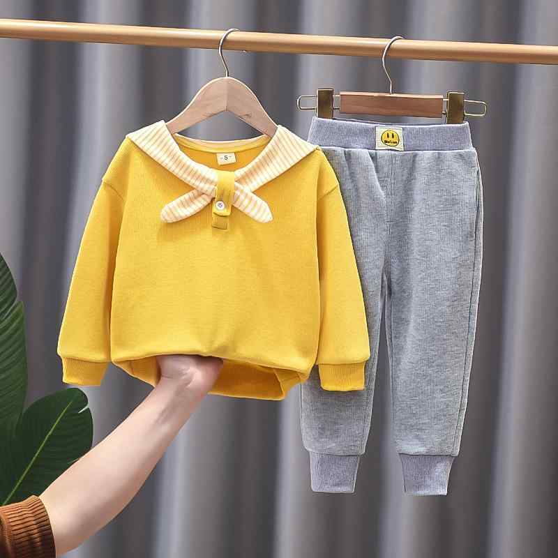 ・カテゴリ: キッズセット・性別: 女の子・スタイル: 韓国風・セットの種類: パンツセット・セット内容: 2点セット・対象年齢: 1〜3歳 (80〜100cm)・適応シーズン: 春、秋・袖丈: 長袖・フード: なし・パンツ丈: ロング丈・厚さ: 普通・主な素材: 綿95%・安全基準: A類・開閉様式: プルオーバー・カラー展開: ピンク、イエロー・サイズ展開: 80cm、90cm、100cm、110cm