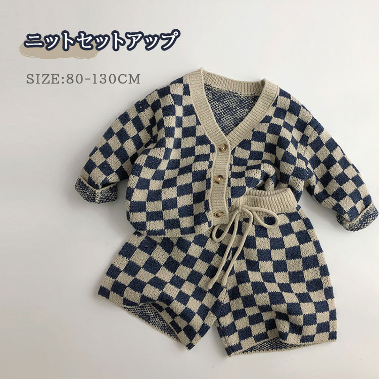 送料無料 キッズ ニット セットアップ ベビー服 カーディガン パンツ カジュアル 女の子 男の子 セーター 赤ちゃん 子供 子ども ニット チェック柄 Vネック 通園 通学 前..