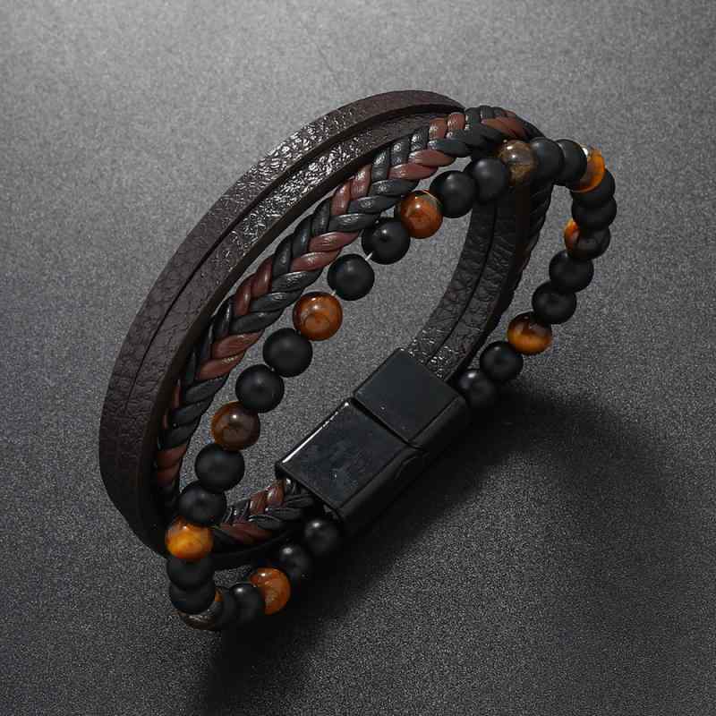 ブレスレット メンズ 男性用 合金 革紐 天然石 タイガーアイ 溶岩石 ビーズ 二重巻き 腕輪 アクセサリー ハンドメイド ブラック 黒色 カジュアル ファッション 普段使い ..