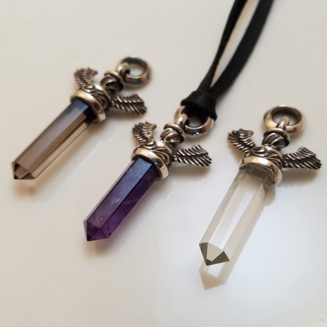 パワーストーンのダブルポイント(六角柱)を使用したエンジェルモチーフのペンダント。燻しチェーンを組み付けたネックレス。 パワーストーンはアメジスト、水晶、スモーキークオーツからお選びいただけます。 革ひも ディアスキン約120cm 幅4.5mm 厚さ1mm ペンダント部分 全長59mm 幅 27mm 厚み 11mm 素材 silver925 革ひもシルバービーズ付きdrive brand concept REAL & EDGE ファッションに際立つスパイスの効いたルックスでありながらユーザーに溶け込むリアルスタンダートを追求。 精巧でありながら上品さも併せ持つ先鋭的な世界観を表現している。 drive=和訳で「走る」「加速」などの意味を持つ英単語から立ち止まらないスタンスをブランド名に引用している。 creation ラインの取り方に拘った製作スタイルは「エッジ」と「アール」を強調しうねりや鋭さを生かす為、一つ一つデザイナーの手で仕上げている。 付属品について 当店でお買い上..