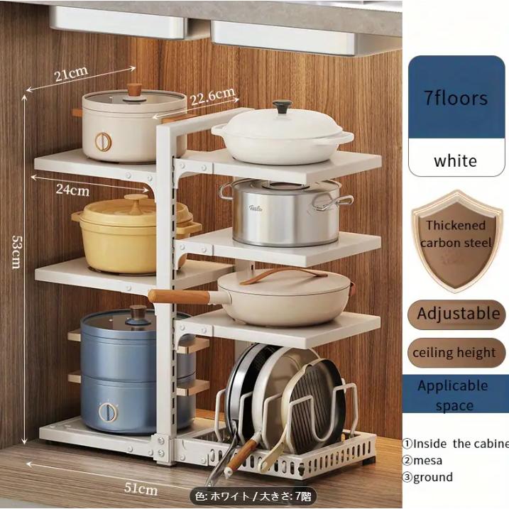 調節可能なヘビーデューティキッチンオーガナイザーラック - 大容量の鍋、フライパン&蓋用、多機能カーボンスチール製、キャビネット下収納付き、調理器具
