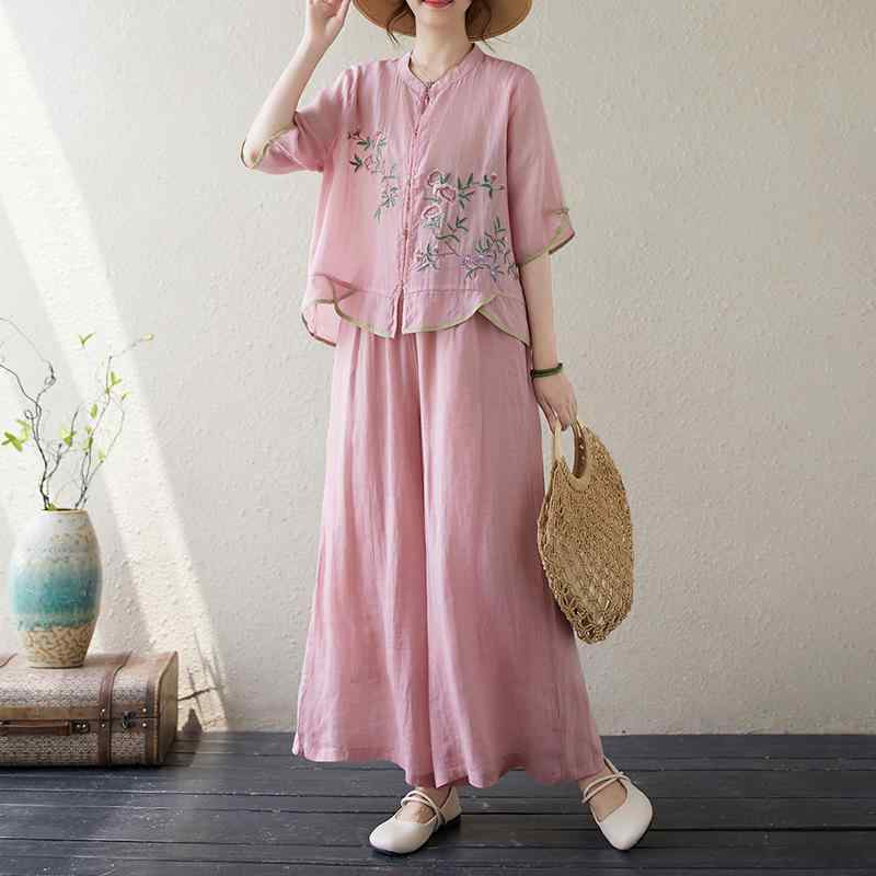 レディース ファッション 服 オシャレ カワイイ シンプル 大人カワイイ 大きいサイズ リネン スーツ 秋 スタンドカラー ボタン ダウン シャツ ストレート ワイド レッグ ..