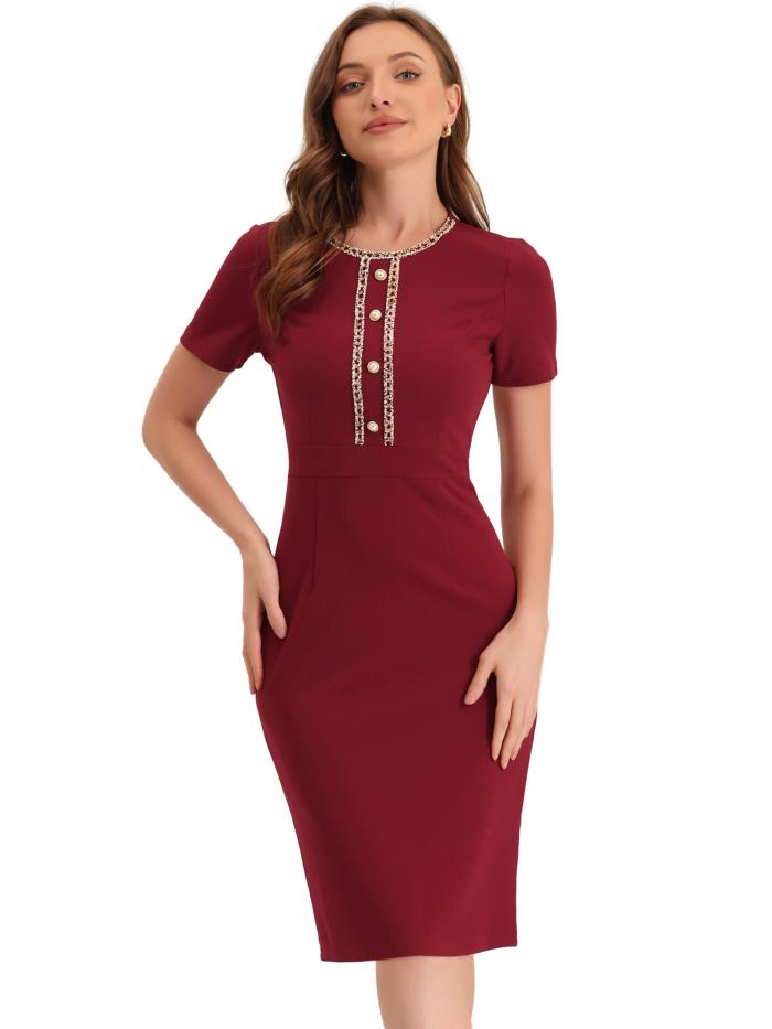 Allegra K ワンピース ボディコン ドレス ワーク ビジネス 半袖 ラウンドネック カラーブロック レディース ブルゴーニュ L