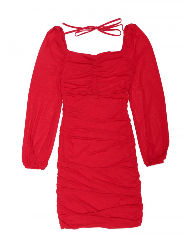 Allegra K ボディコンドレス ミニワンピース エレガント パフスリーブ メッシュ クラブ レースアップ パーティー レディース レッド XS