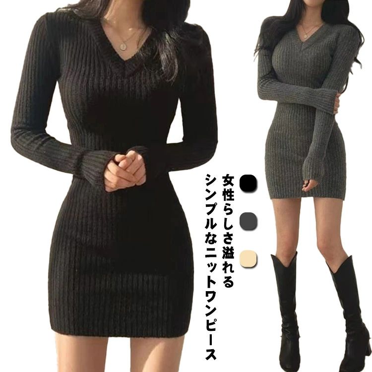 セクシ 胸元 セーター 秋冬 ボディコン ドレス レディース セクシー ワンピ シンプル ミニ丈 長袖 タイト ニットワンピース リブ