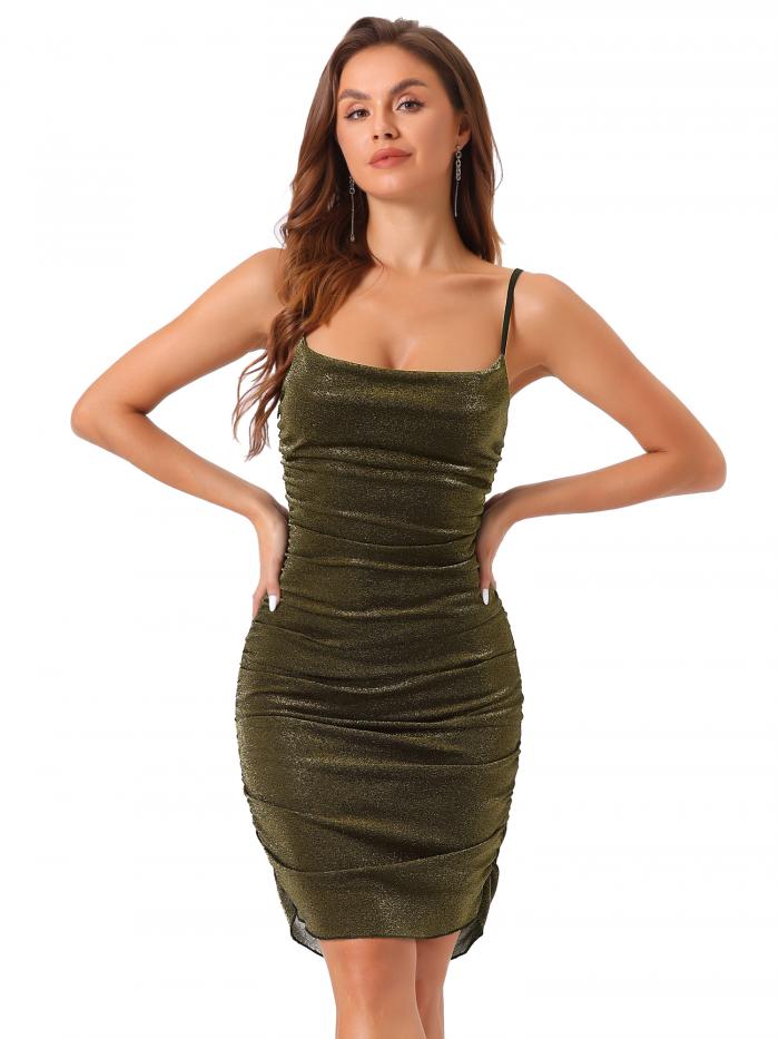 Allegra K ミニドレス ボディコン ドレス スパゲッティストラップ シャーリング パーティーレ ディース ゴールド XS