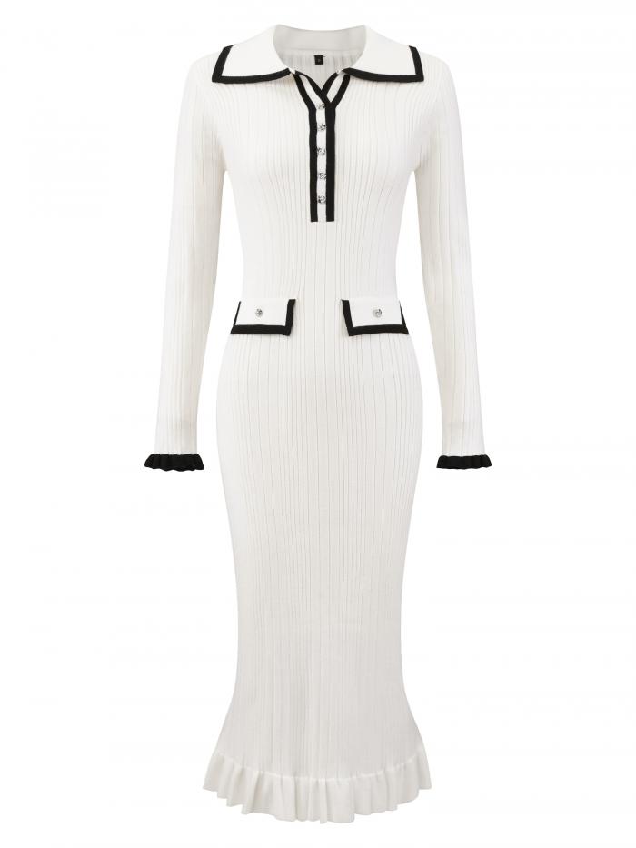 Hobemty レディース 長袖 セータードレス コントラストトリム フリル 秋冬 リブニット ボディコンドレス ホワイト XL