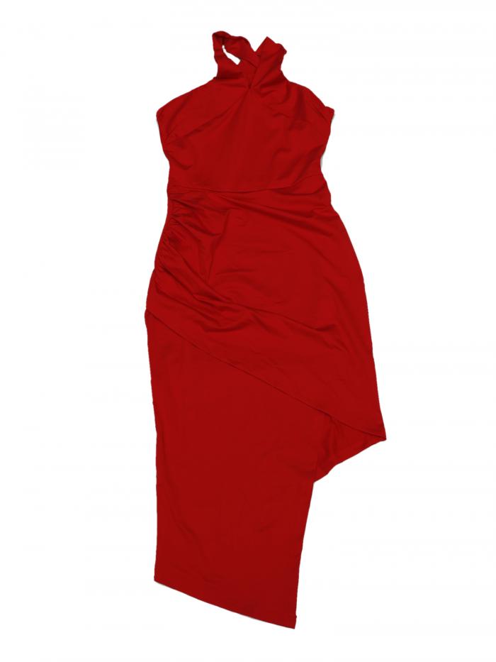 Allegra K レディース パーティーミディドレス ルターネック ノースリーブ ルーシュ アシンメトリーボディコンドレス レッド XS