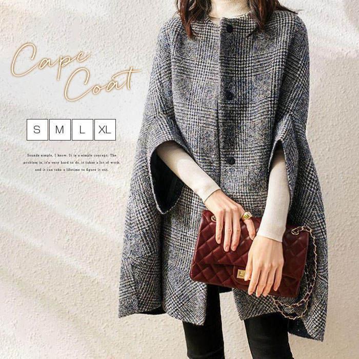コート レディース 秋 冬 ポンチョ コート 秋冬チェック柄 ケープコート アウター 秋 ボレロ ポンチョ マント 羽織 ブルゾン 前開き ツイード風 ノーカラー 大人