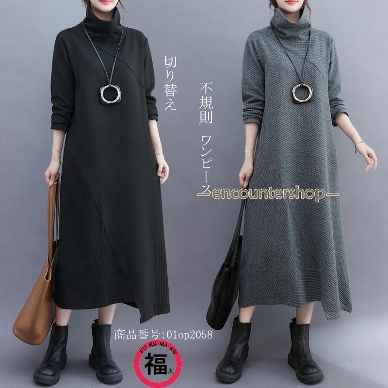 ロングワンピース 切り替え 不規則 ハイネック Aラインワンピース ワンピース 通勤 長袖 ゆったり 大きいサイズ マキシワンピ ロングワンピ