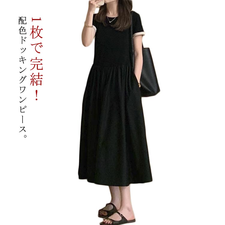 ロングワンピース レディース ポケット付き aライン ドッキングワンピース ポケット付き 半袖ワンピース ロング丈 フレア ウェストシャーリング 体型カバー 春夏 春 夏