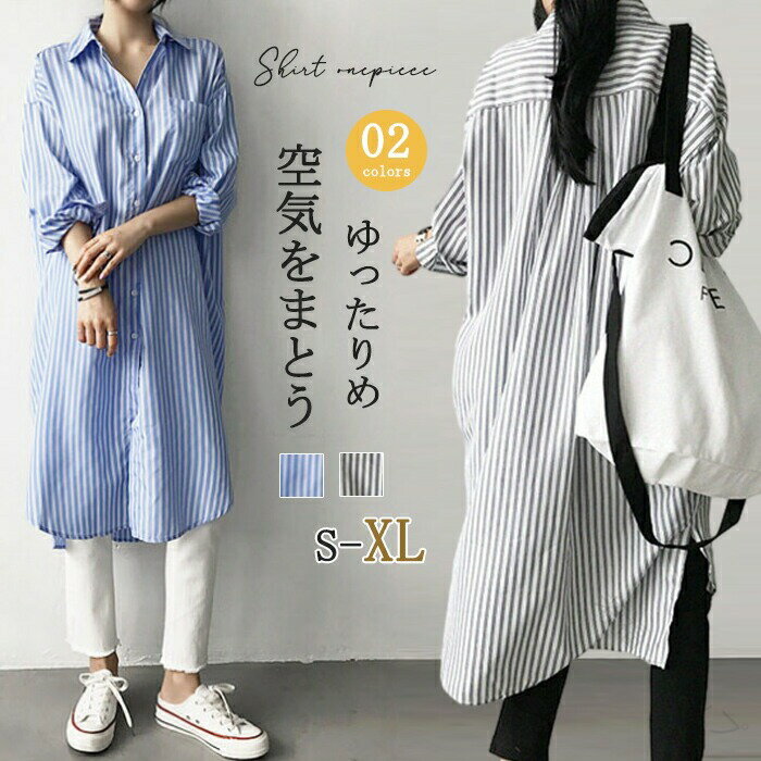 大きいサイズ 長袖 透けない ロングシャツ ワンピース レディース 春夏対応 マキシワンピース シャツワンピ ボーダー柄 カジュアル着用可能