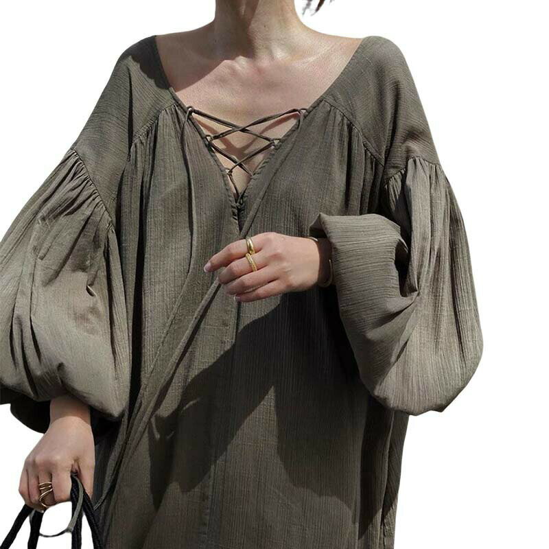 ワンピース レディース マキシワンピース 長袖 ボリューム袖 Vネック レースアップ 背中あき バルーン袖 編み上げ リゾート バカンス ビーチ 海 夏