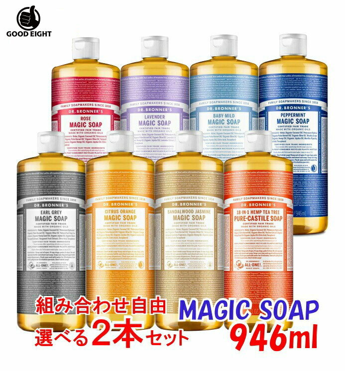 この商品は 【北海道・沖縄・離島も送料無料】【選べる2本】ドクターブロナー マジックソープ 946ml ベビーマイルド ラベンダー アールグレイ ローズ アールグレイ ペパーミント ティートゥリー シトラスオレンジ DR. BRONNER'S 【オーガニック】【天然由来成分100%】【無農薬有機栽培】 ポイント【天然由来成分100%】【無農薬有機栽培】 ドクターブロナーマジックソープ マジックソープは、メイクアップアーティストやスーパーモデルなどプロの口コミから全米に広がったカスチール石鹸です。単純なオリーブ石鹸とは違い、オリーブ油、ヤシ油をベースに、美肌成分として注目のヘンプ油と保湿成分ホホバオイルをブレンドした天然ソープです。毛穴の黒ずみを溶かすのに突っ張らず、さっぱりしているのにスベスベ肌に洗い上げます。天然成分だけで作られている為、クレンジング、洗顔、ボディ洗浄、洗髪、食器洗いや洗濯にも使えます。※使用用途に合わせ..