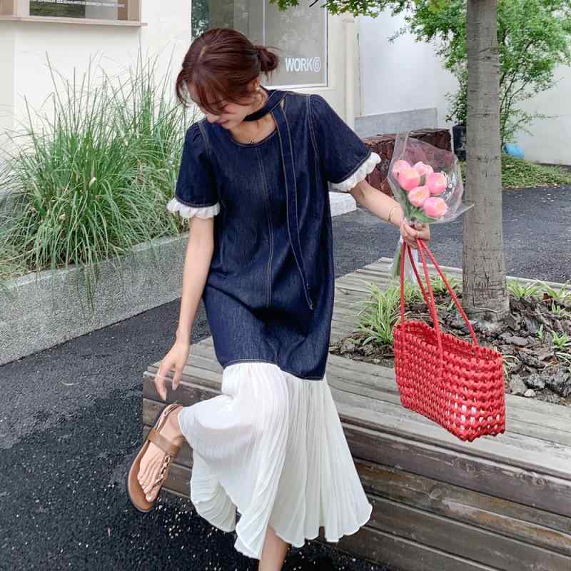 ワンピース ドレス レディース フレンチテイスト 上品 エレガント 高級感 切り替え デニム 半袖 ハイウエスト マーメイド 体型カバー 細見え 通勤スタイル 春夏