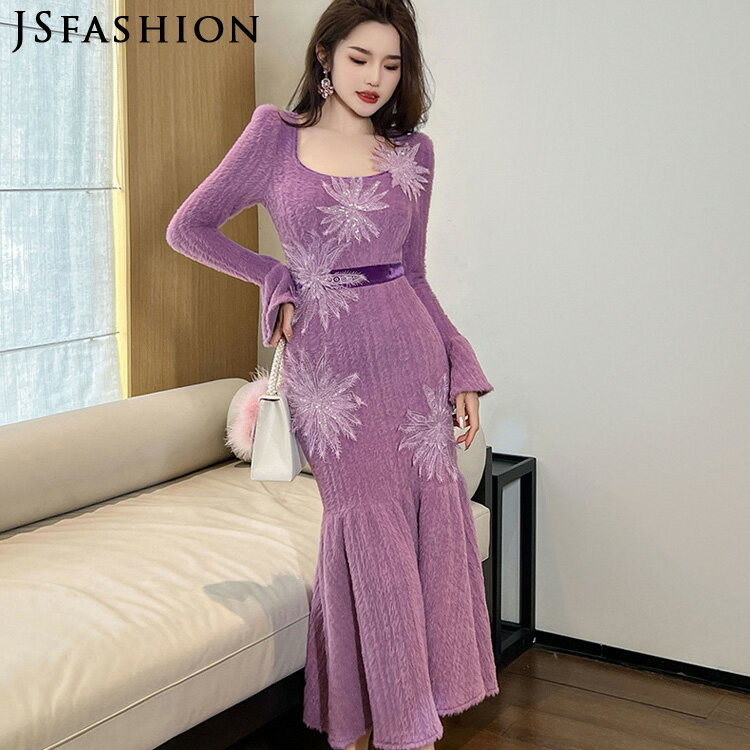 マーメイド ニット ロングワンピース ファータッチ 立体フラワーデザインフレアスリーブ ストレッチ フェミニンエレガント 深い スクエアラウンドネック 長袖 ロング丈 ..
